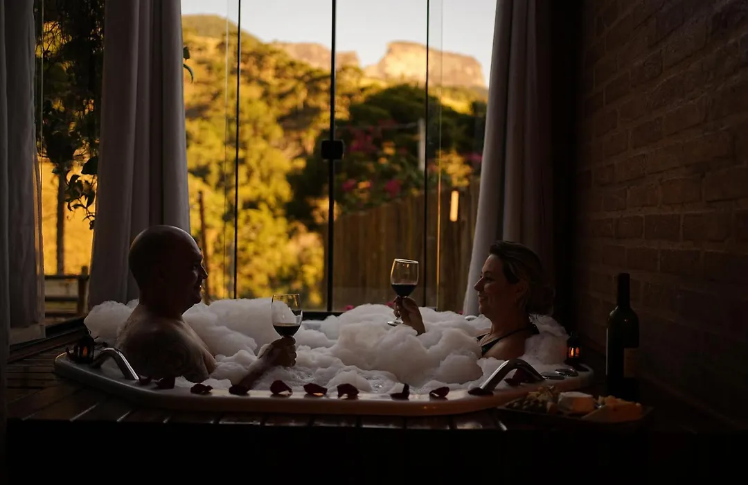 Offering the mountain views, Chale Romantico, Lareira, Jacuzzi-Vista Pedra Bau - Chale Petra villa features a terrace. This Sao Bento do Sapucai accommodation comes with a bathroom with a spa bathtub, a separate toilet, and a shower. There are a hair dryer and bath sheets for guests' comfort.